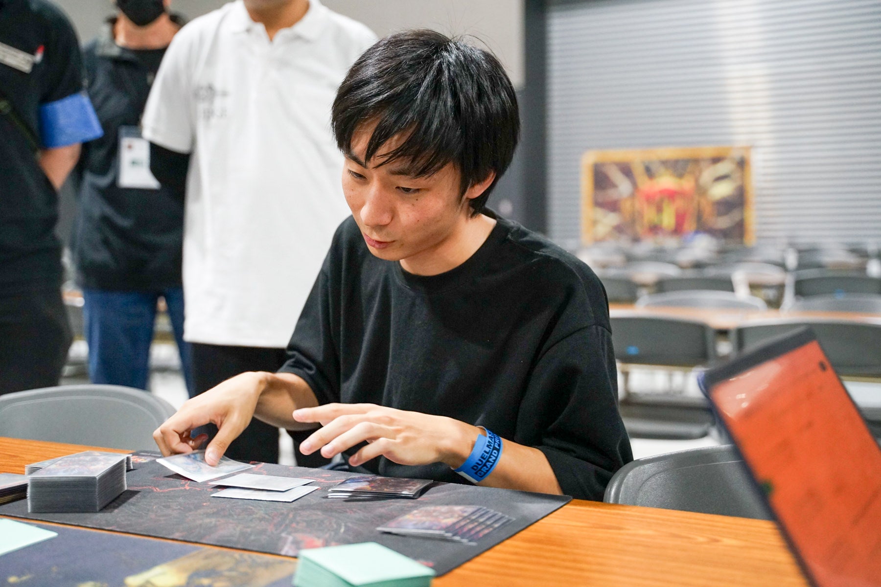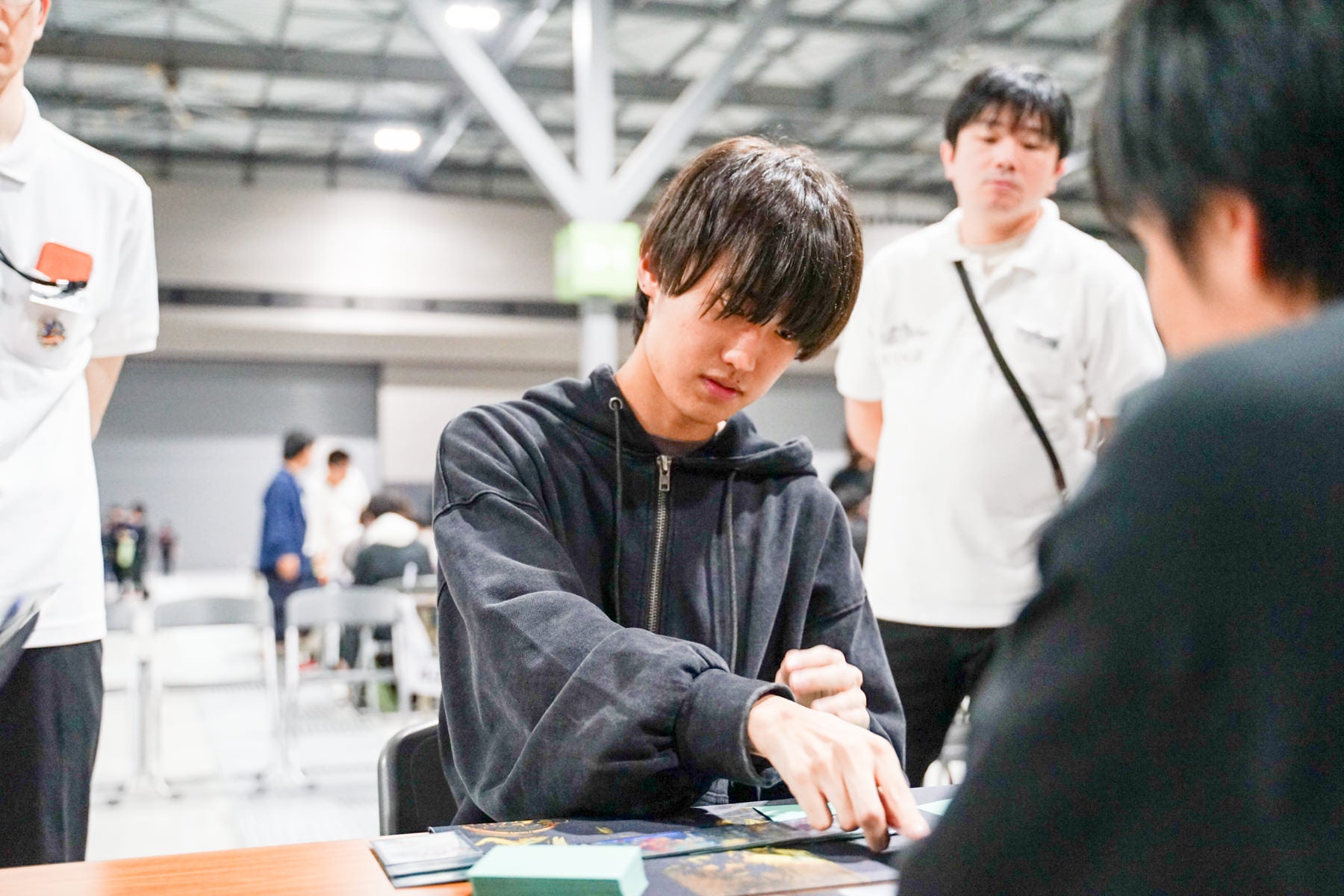その机の片側に座るのは、とり🐥。過去にはDMGP2023-1st DAY2(オリジナル)でトップ8に入賞したほか、最強位決定戦と2023年度の日本一決定戦に出場した経験を持つ関西の強豪だ。近年では認定ジャッジ資格も取得し、CS開催に協力するなど、コミュニティへの貢献度も高い。