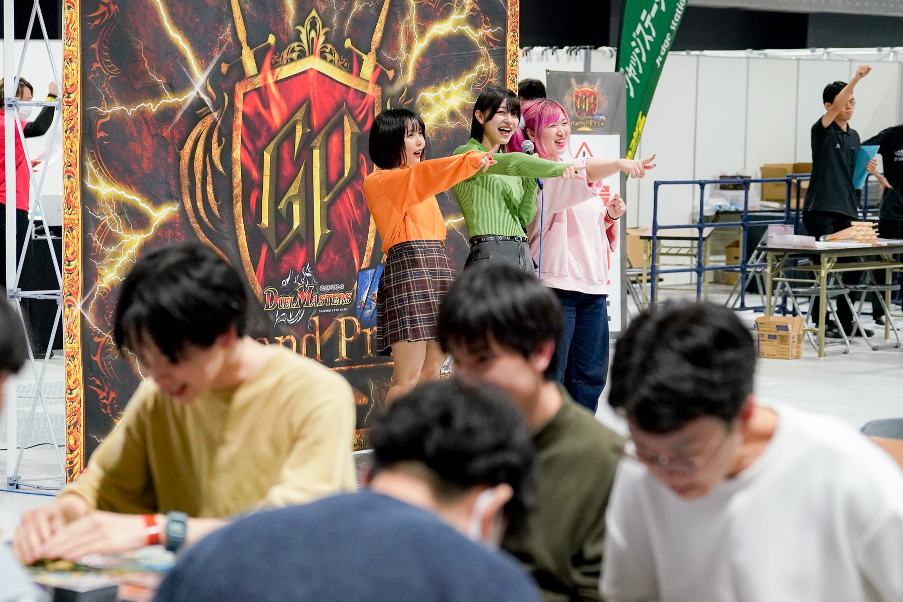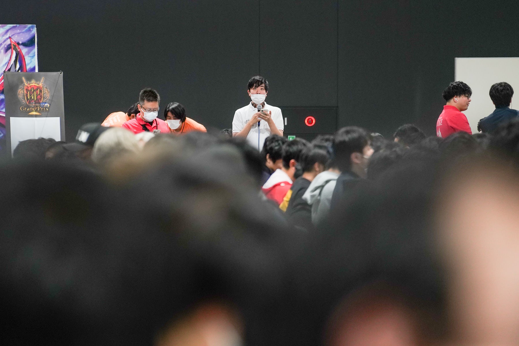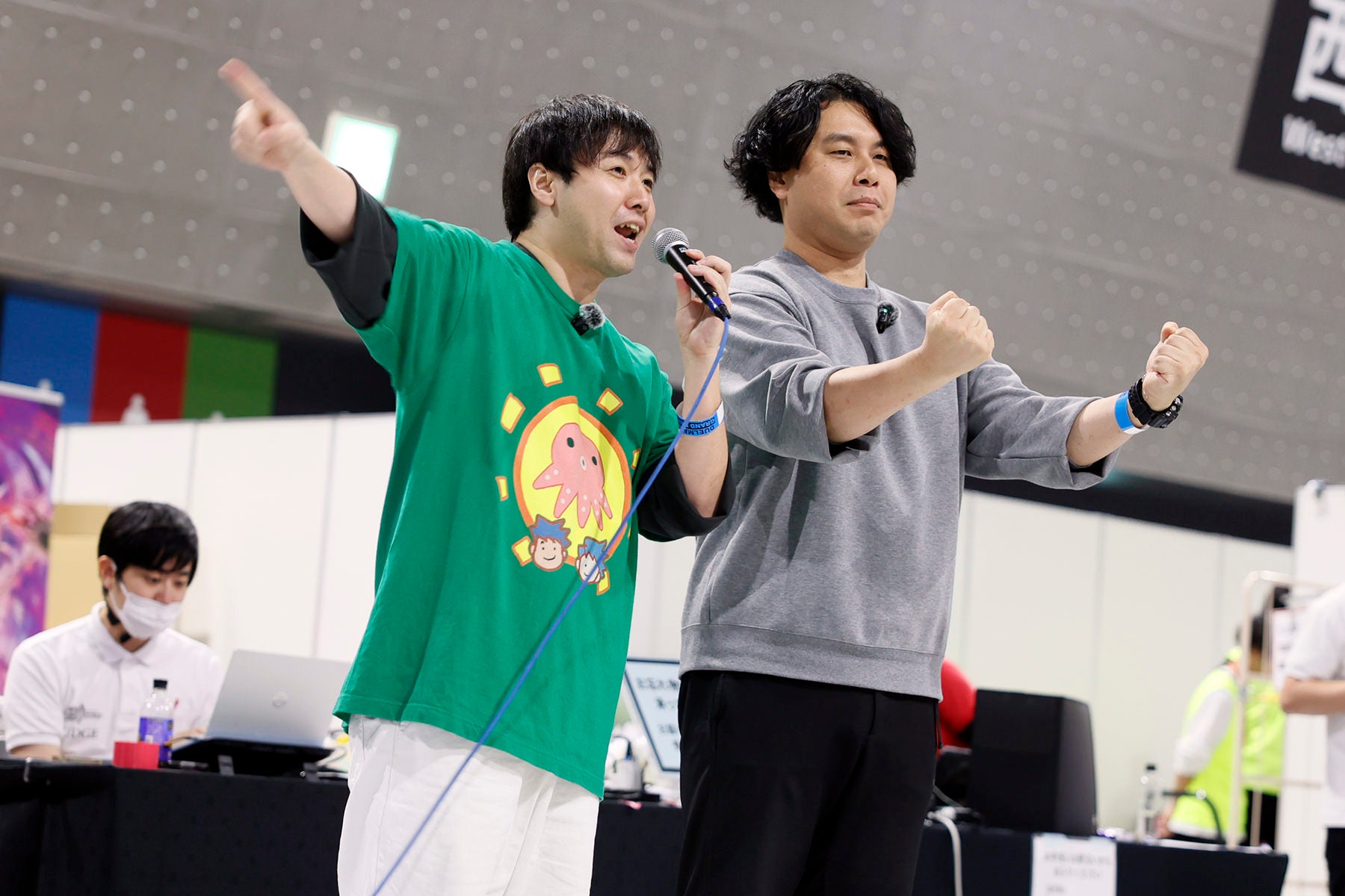 決勝ラウンドの開始をコールするのは、本日出場して最後まで戦い抜いたという斬札ガッツ役の菅原雅芳さん(左)と、サッヴァーク-MAX役の赤坂柾之さん(右)です。場内におふたりのいい声で「デュエマ、スタートーーー!!!」が響き渡りました。