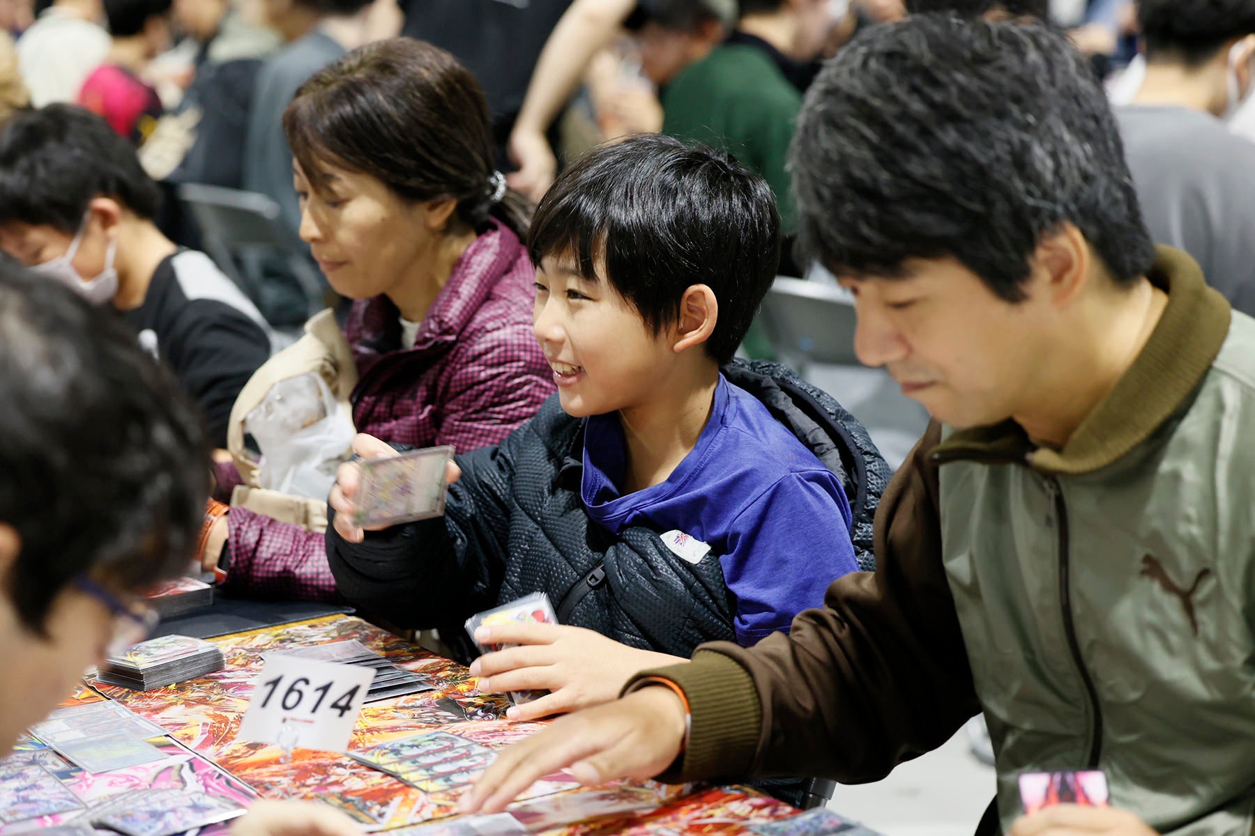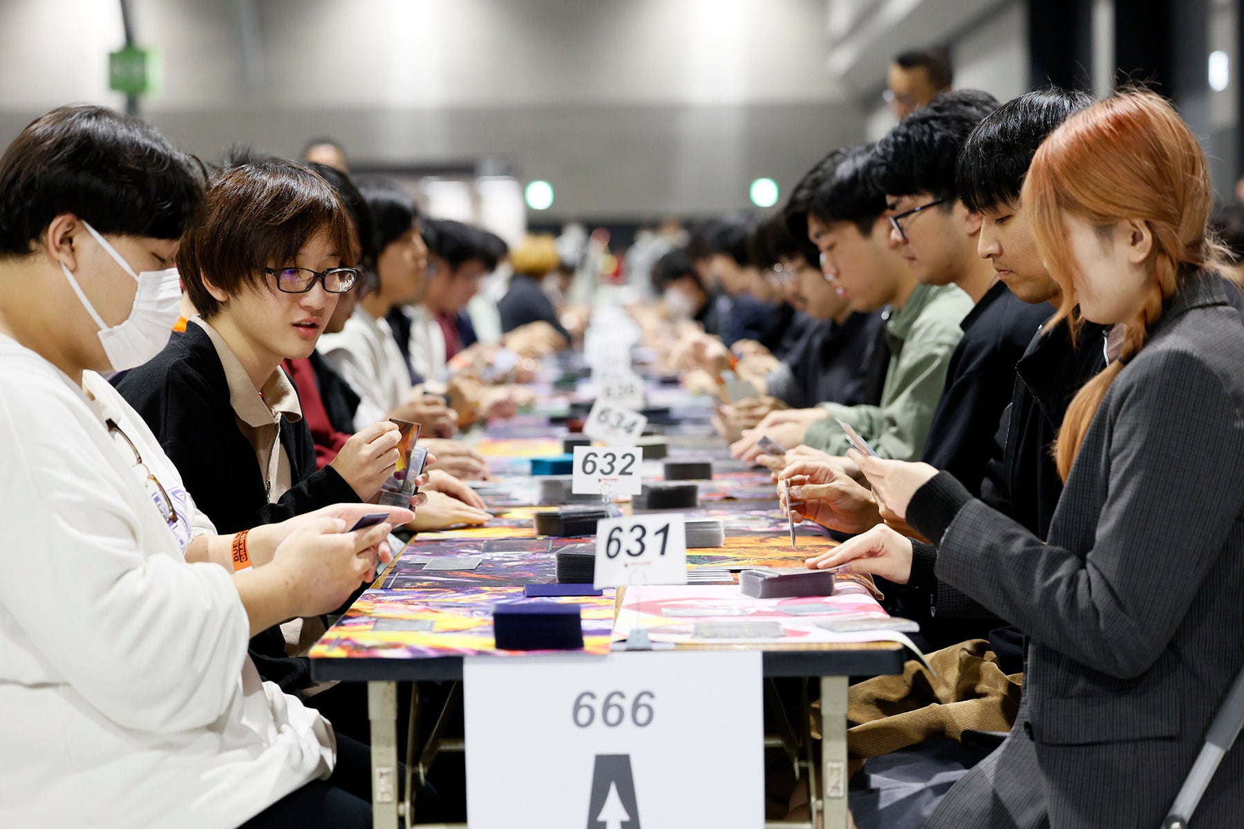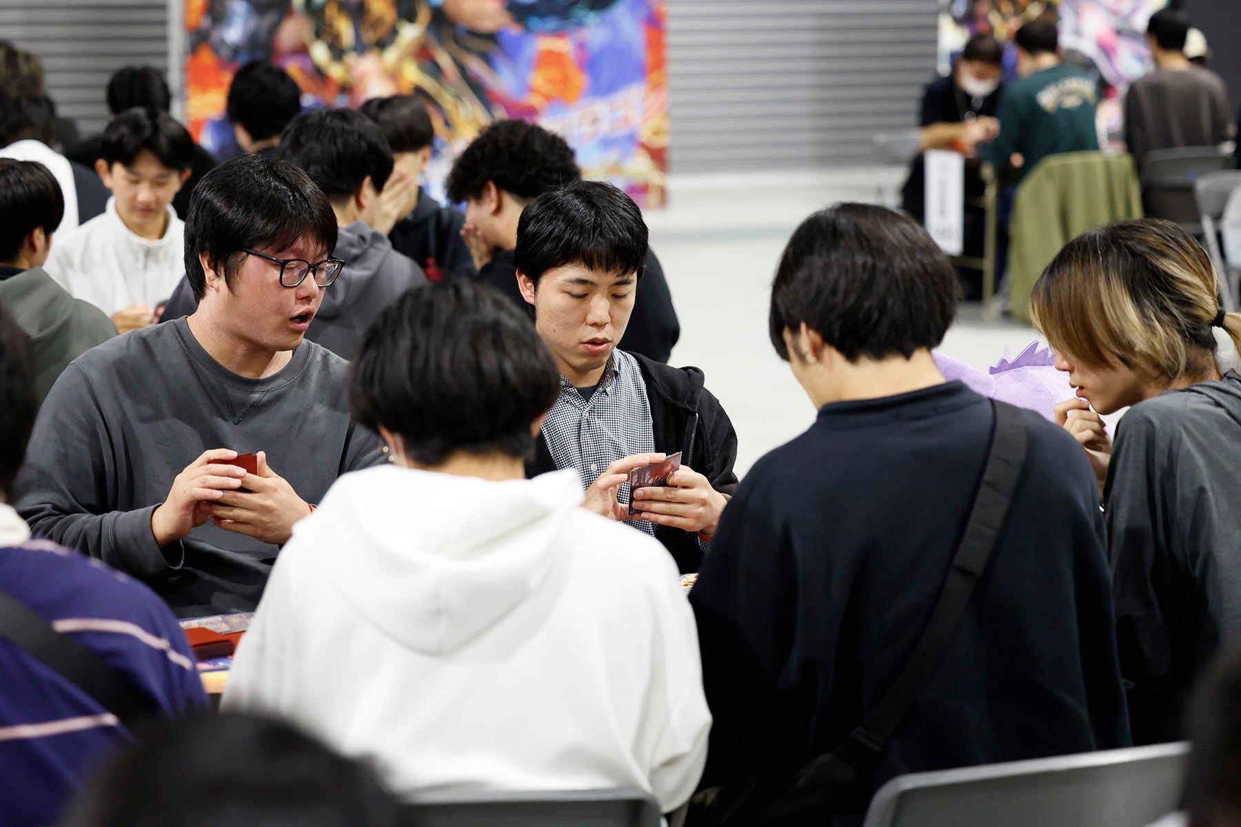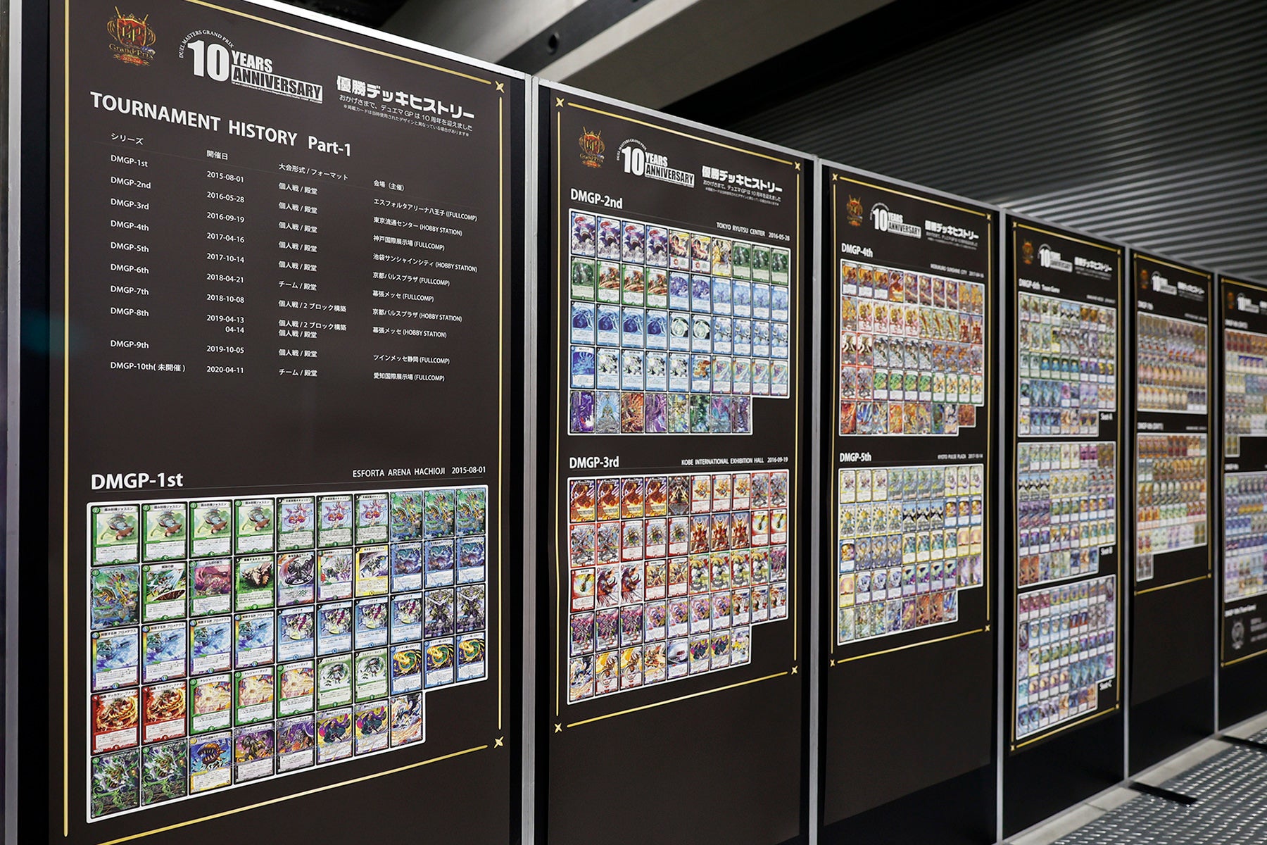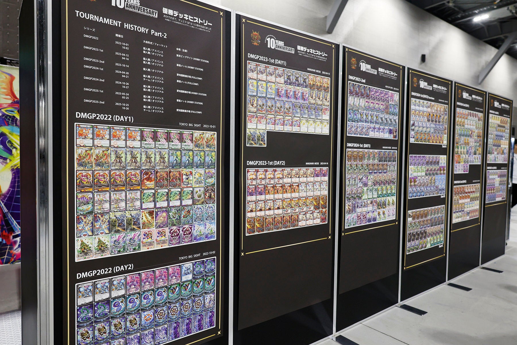 2015年に始まったグランプリは、今年で10周年を迎えました。それを記念した優勝デッキの展示です。2020年から2年間、大型大会が開催できない期間もありましたが、またこうして大勢で集まれるようになってうれしいですね。