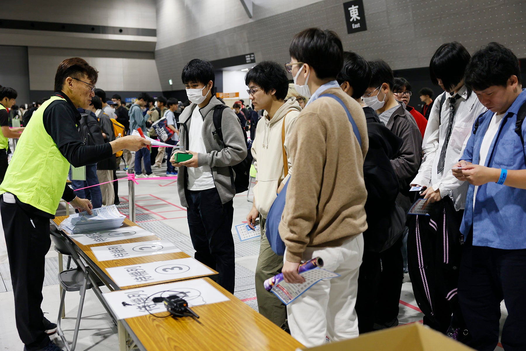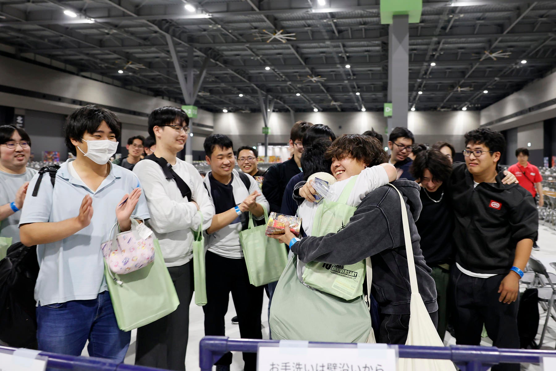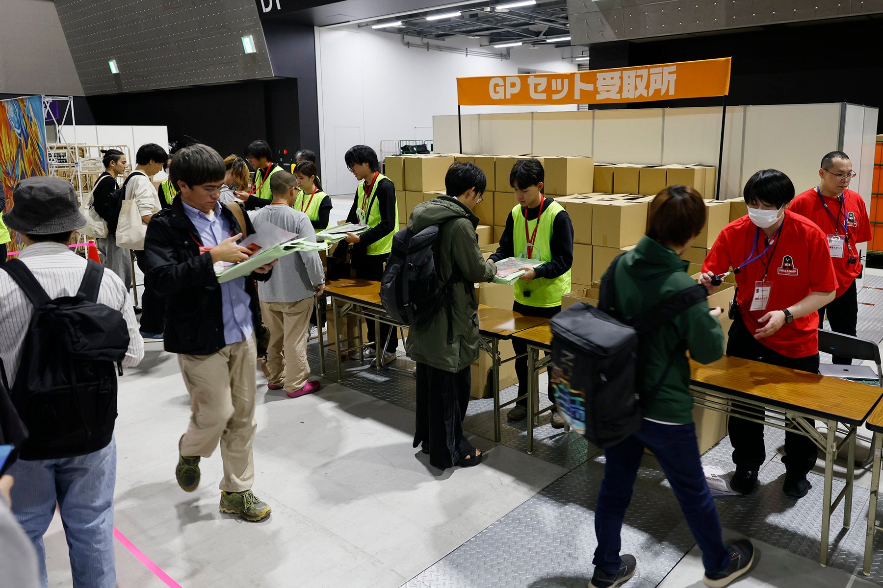記念グッズが詰まったGPセットの受取所。オープンすると、大勢がさっそく列を作りました。