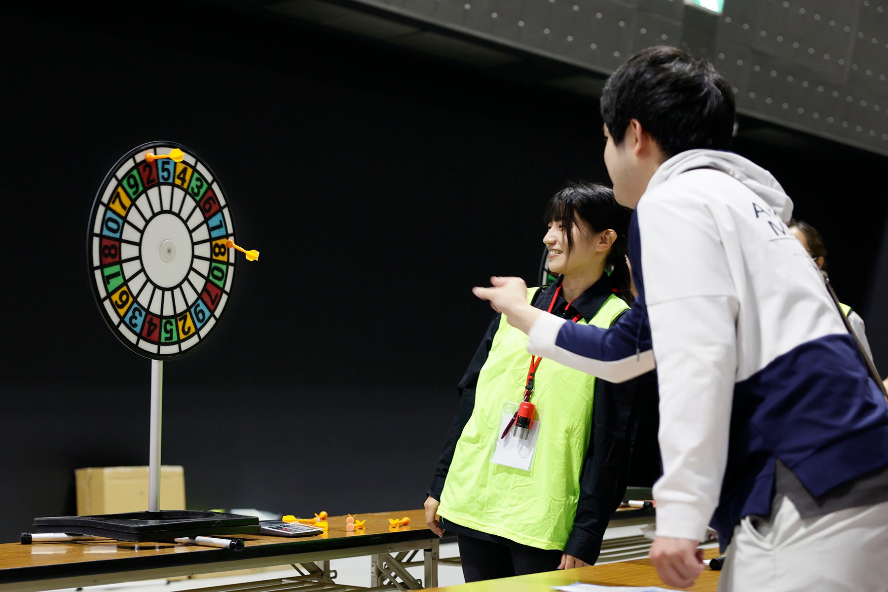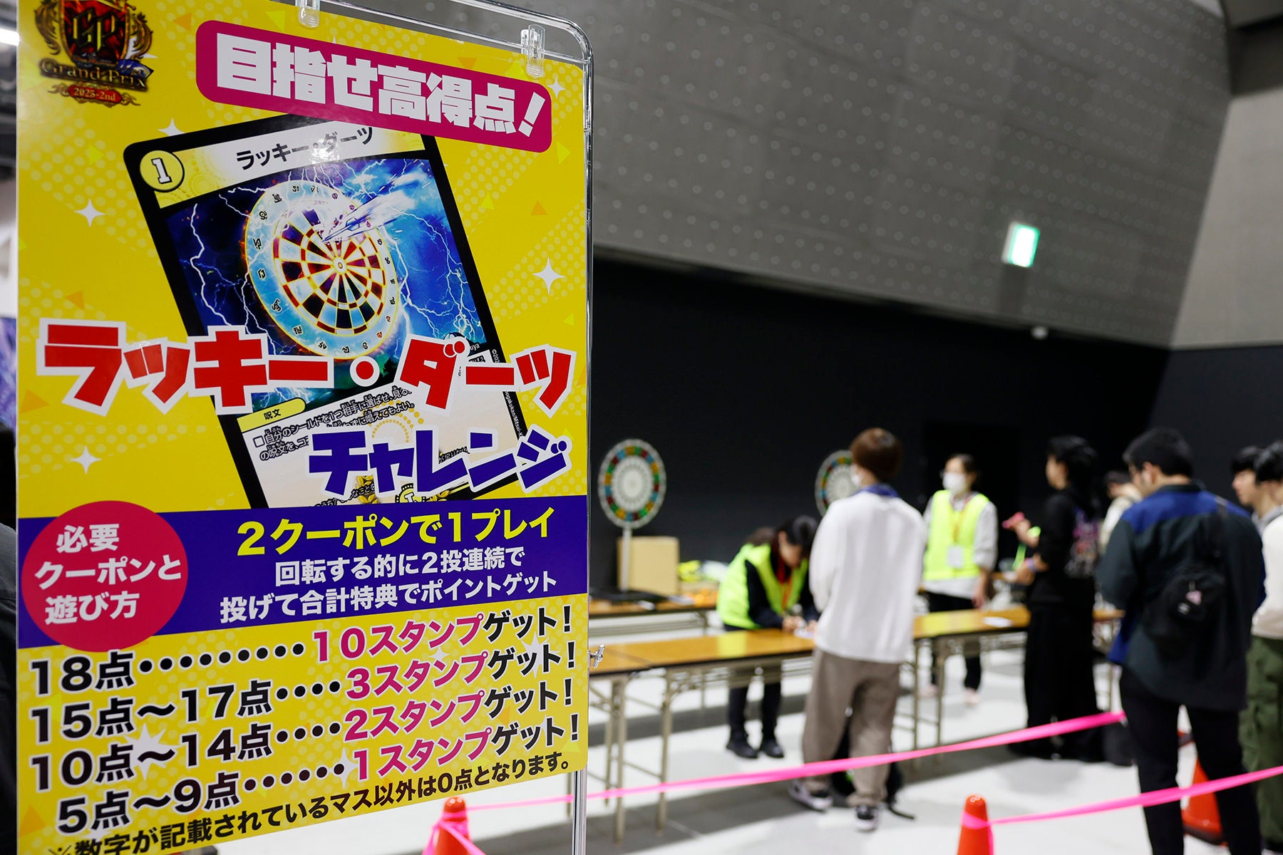 スタンプを集めて豪華景品と引き換えられるサイドイベントも人気です。こちらは「ラッキー・ダーツ チャレンジ」。回転する的をめがけてダーツを投げるのは見た目以上に高難易度のようです。