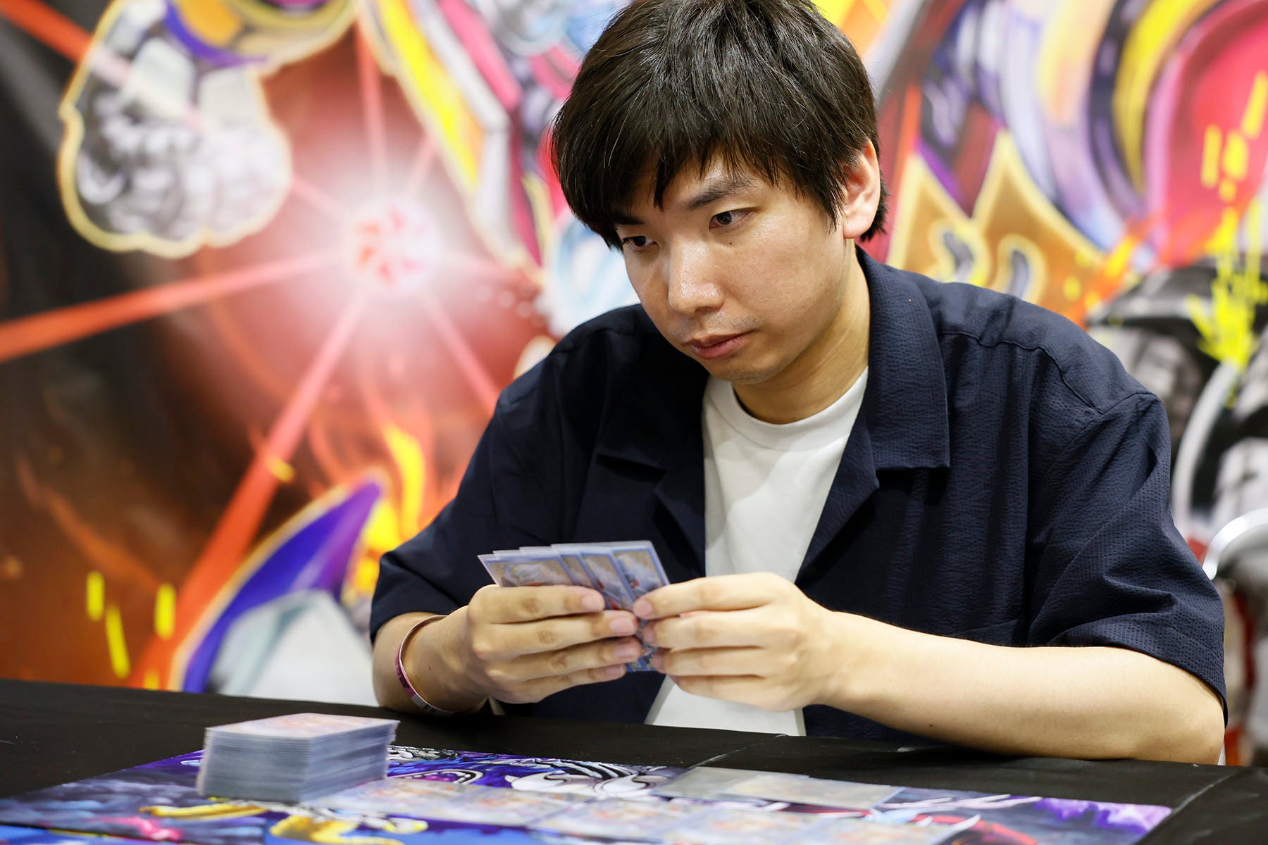 そんなデッキを、楽道は今日だけでもう13回も回しているのだ。まして蒸し暑い熱気のこもった会場で、慣れないフィーチャーマッチ。極限の負荷のもと、それでも楽道は戦っていた。