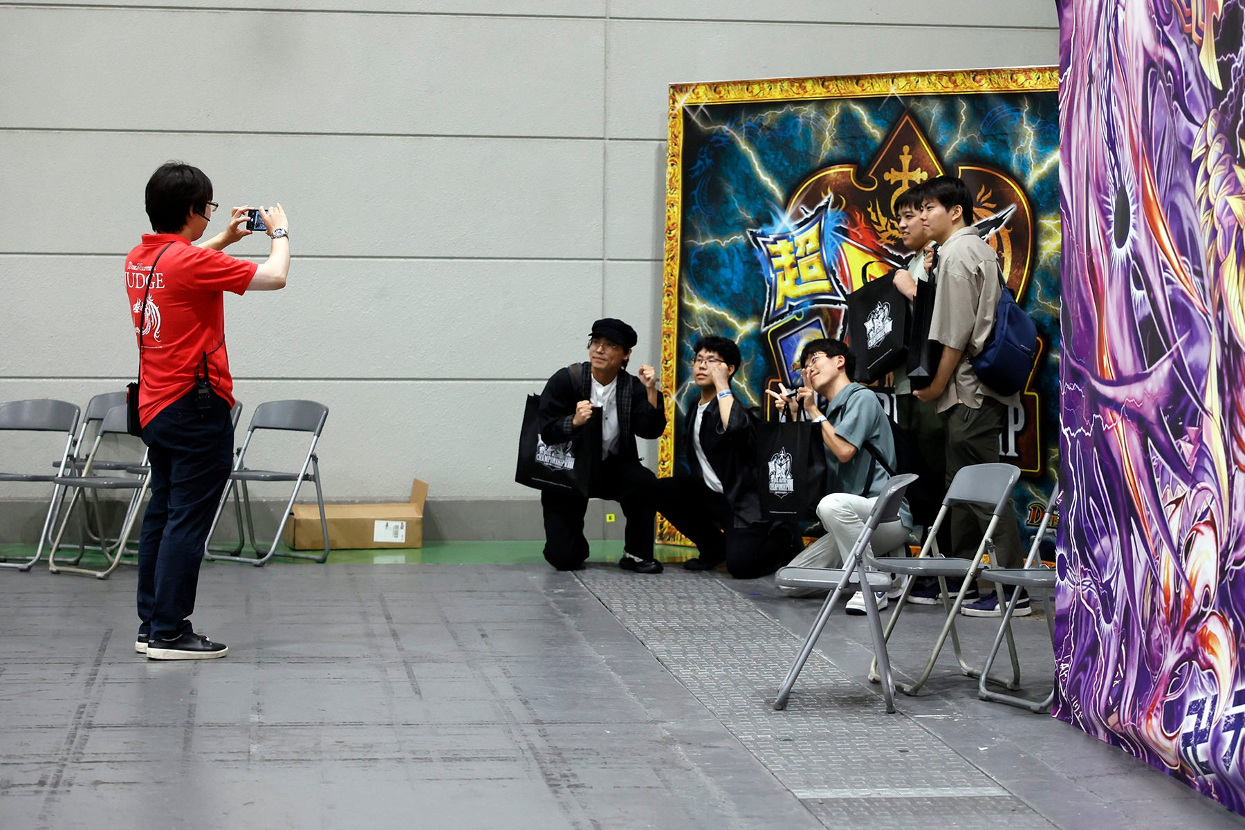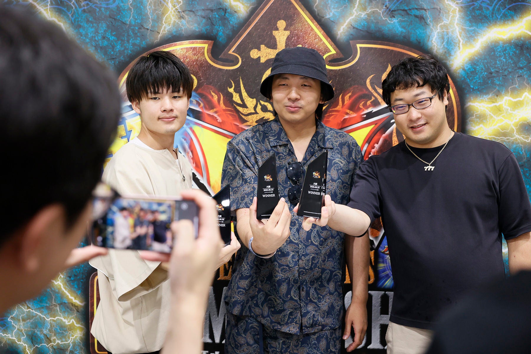 優勝したのはチーム「特攻の卓」の皆さんでした! Xに投稿するためのトロフィーショットを撮影しています。