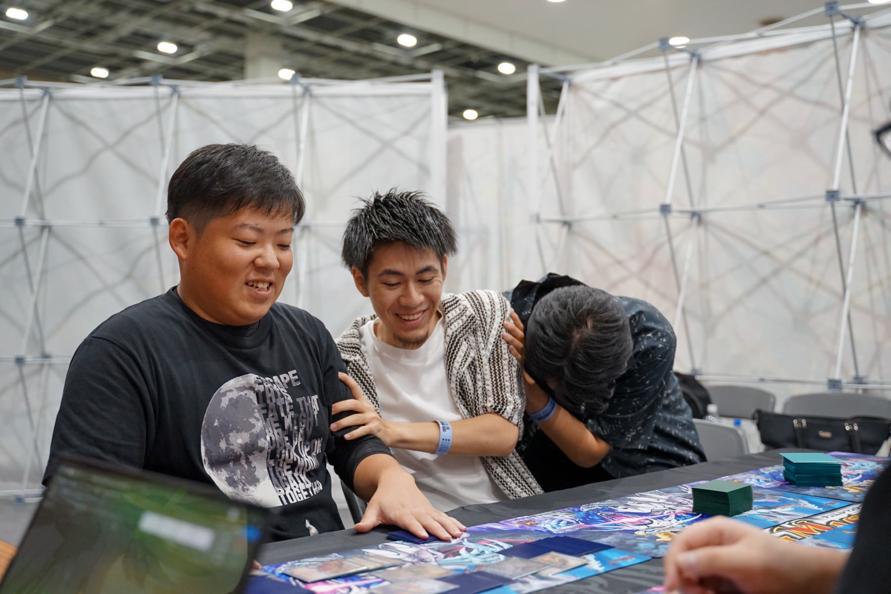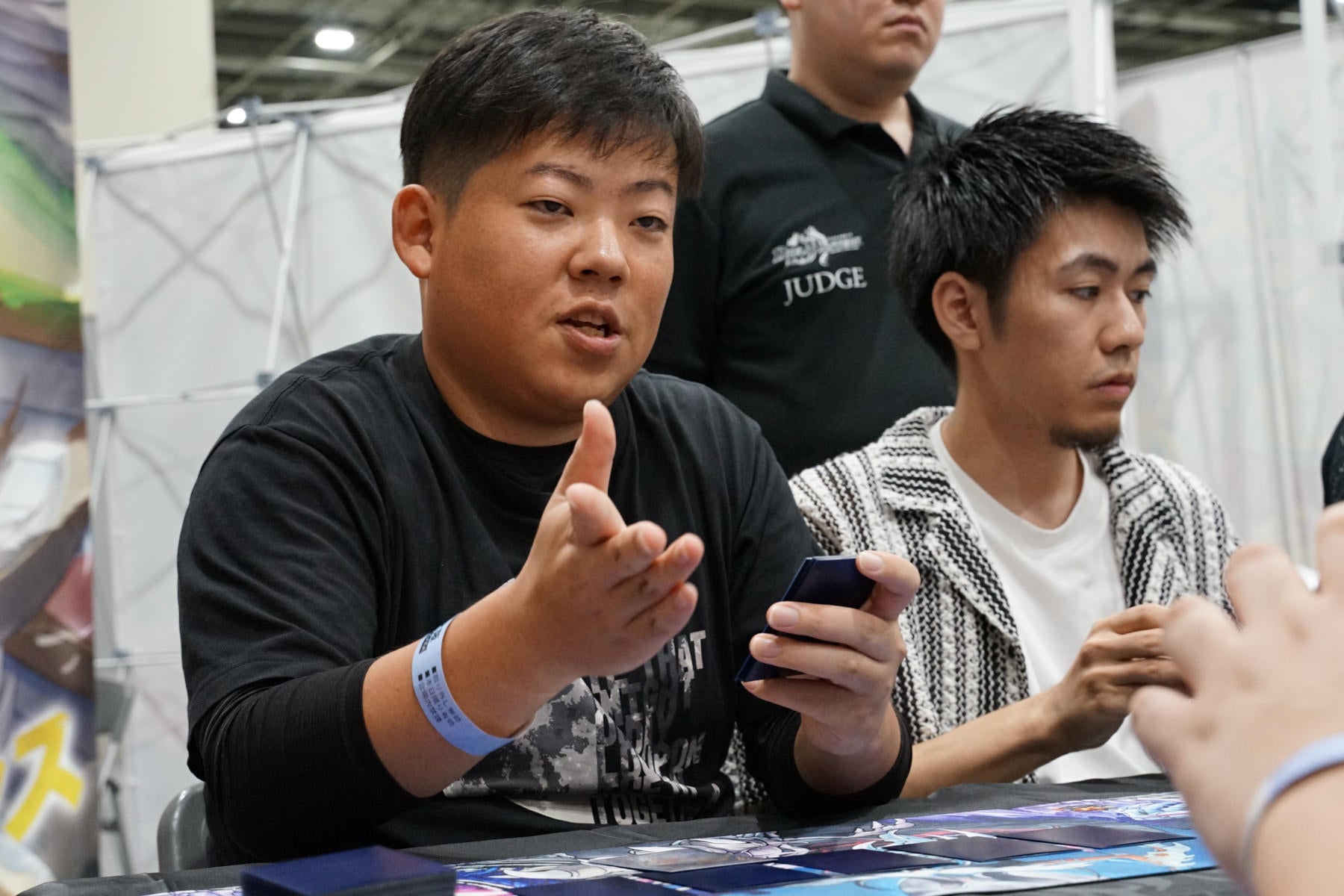 そんなTJMだったが《マクスハト》や《愛銀河マーキュリー・スターフォージ》を使って先に仕掛けるも、メクレイドの内容に恵まれず、後攻ながらじゃーまんが先に《昇カオスマントラ》2枚を進化元にした《愛銀河マーキュリー・スターフォージ》を使って山札の上から《シュトラ》を見つけ出すと、ループの導入の説明の部分で、全てを理解したTJMは投了を宣言。その間にC卓ではまぁつが速やかにループを決め1本を取り、A卓でもうぇしるが同様にループの証明を始めたところであり、チームとしては優勢な状態でそれぞれの卓が2本目の試合へ順次移行していった。