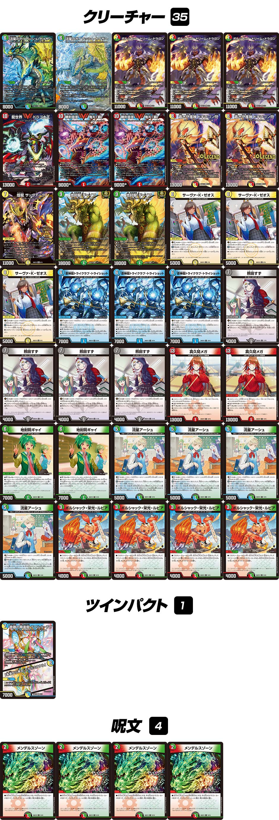 - 1. ド派手なドラゴンを連打してバトルゾーンを制圧しよう!ただし、強力なドラゴンを呼び出すためには大量のマナが必要!ドラゴンデッキの特権である《メンデルスゾーン》や《ボルシャック・栄光・ルピア》で一気に2枚マナ加速だ!