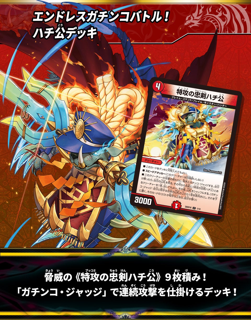 - 1. このデッキは、デッキに何枚でも入れられる《特攻の忠剣ハチ公》を大量に投入した、一撃必殺のコンボ・ビートダウンデッキ!《特攻の忠剣ハチ公》で攻撃した後の「ガチンコ・ジャッジ」に勝利し続けられれば、たった1枚でどんな状況からでも一気に勝利をもぎ取ることができる、ロマン溢れるデッキになっているぞ!