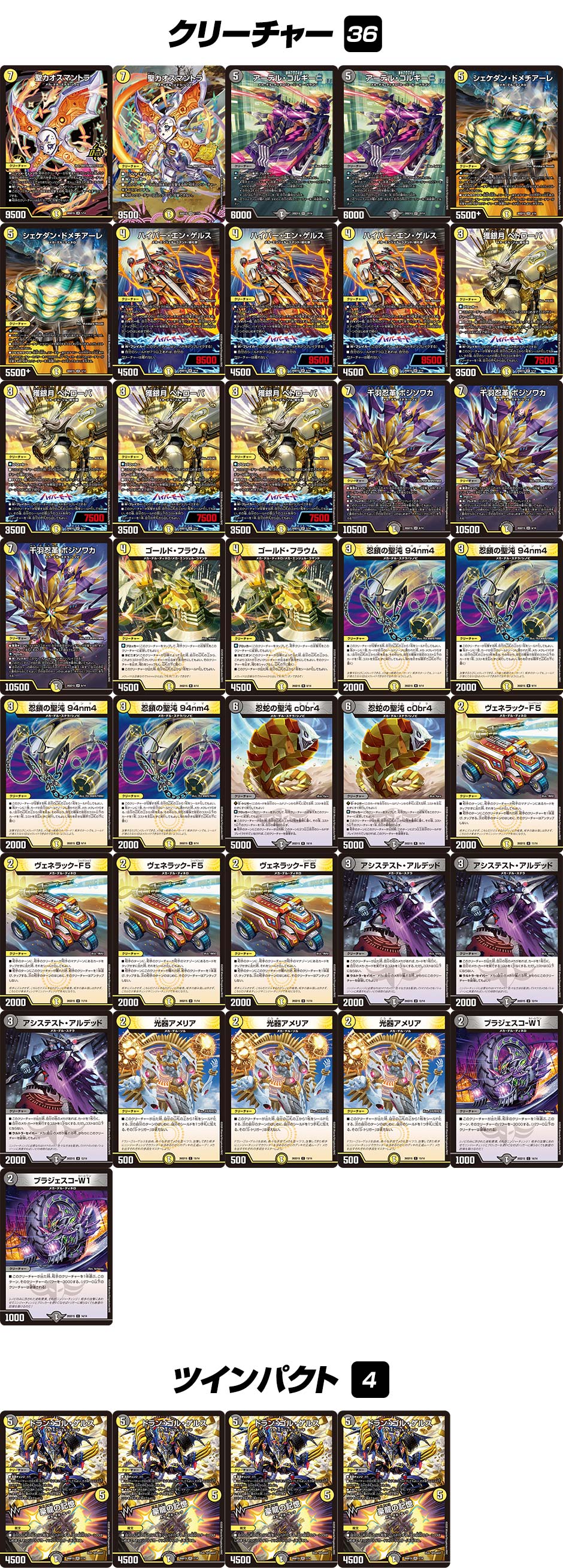 - 2. 無事に小型メカを並べたら、それを利用してさらにクリーチャーを増やしていこう!小型から革命チェンジできる≪ドラン・ゴル・ゲルス≫は、このデッキの展開の要。他にも、《獲銀月 ペトローバ》や《忍鎖の聖沌 94nm4》など、このデッキには次々とクリーチャーを呼び出せるメカが満載なのだ。これらを駆使してメカを展開しつつ、《シェケダン・ドメチアーレ》や《アーテル・ゴルギーニ》などの強力な5マナのメカ召喚を狙っていけば、あっという間にバトルゾーンはメカ軍団で埋め尽くされるぞ!後は大量の物量で一気に相手を押しつぶすだけだ!