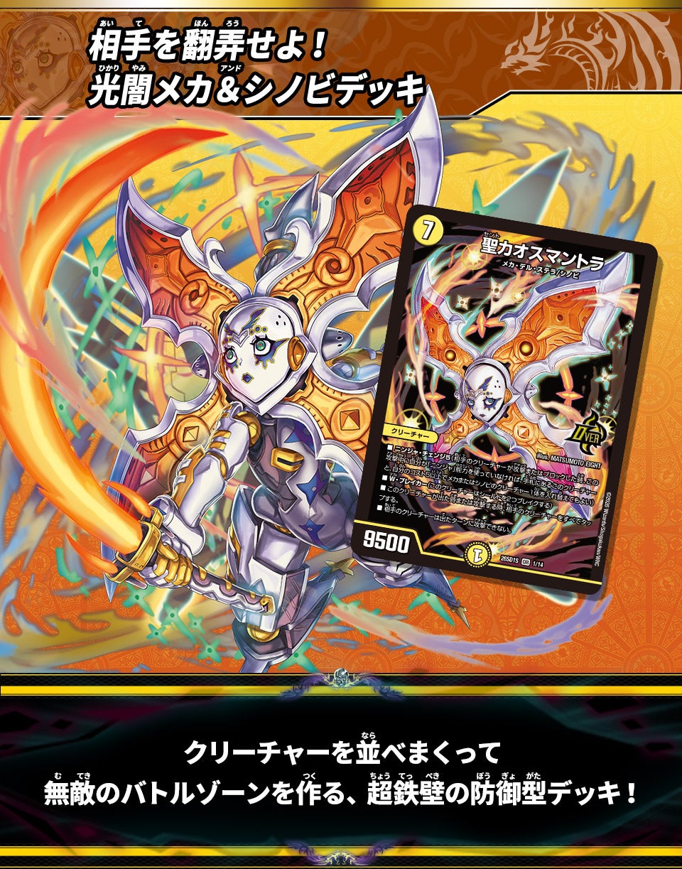 - 3. このデッキの防御面を支えるのは、守りの絶対エース《聖カオスマントラ》!相手のクリーチャーが攻撃かブロックをした時に、自分のコスト5以上のメカがいれば、「ニンジャ・チェンジ」によって手札から入れ替えて出すことができるのだ。出た時に相手のクリーチャーをすべてタップできるので、どんな大群相手でもたちまちシャットアウト!ピンチの時にはいつでも使えるように、できるだけ早くコスト5以上のメカをバトルゾーンに送り込んでおこう。「ニンジャ・チェンジ」を自由自在に使うことこそが、このデッキを使いこなすカギなのだ!