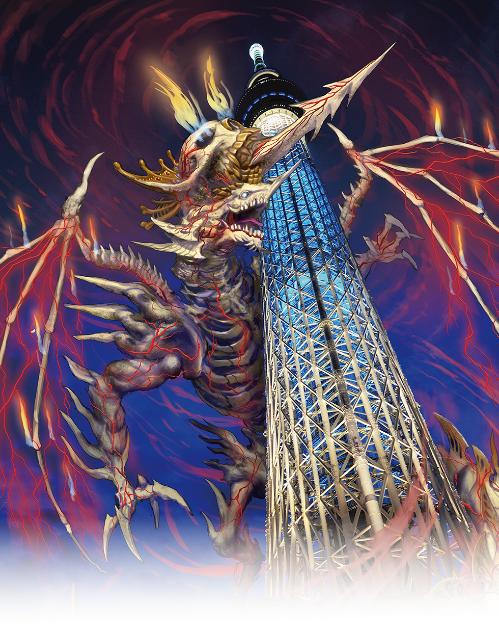 レインボーブリッジなど、都内各所でアビスが大暴れ。実写画像に描かれたアビスは、力強い存在感を放ちます。
